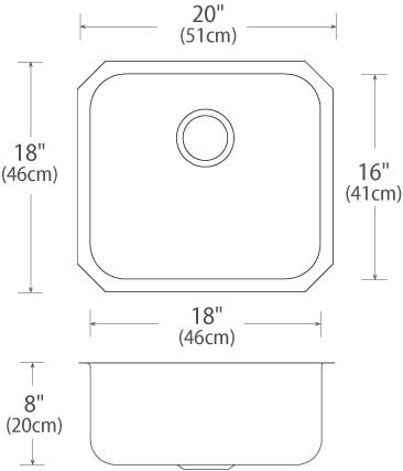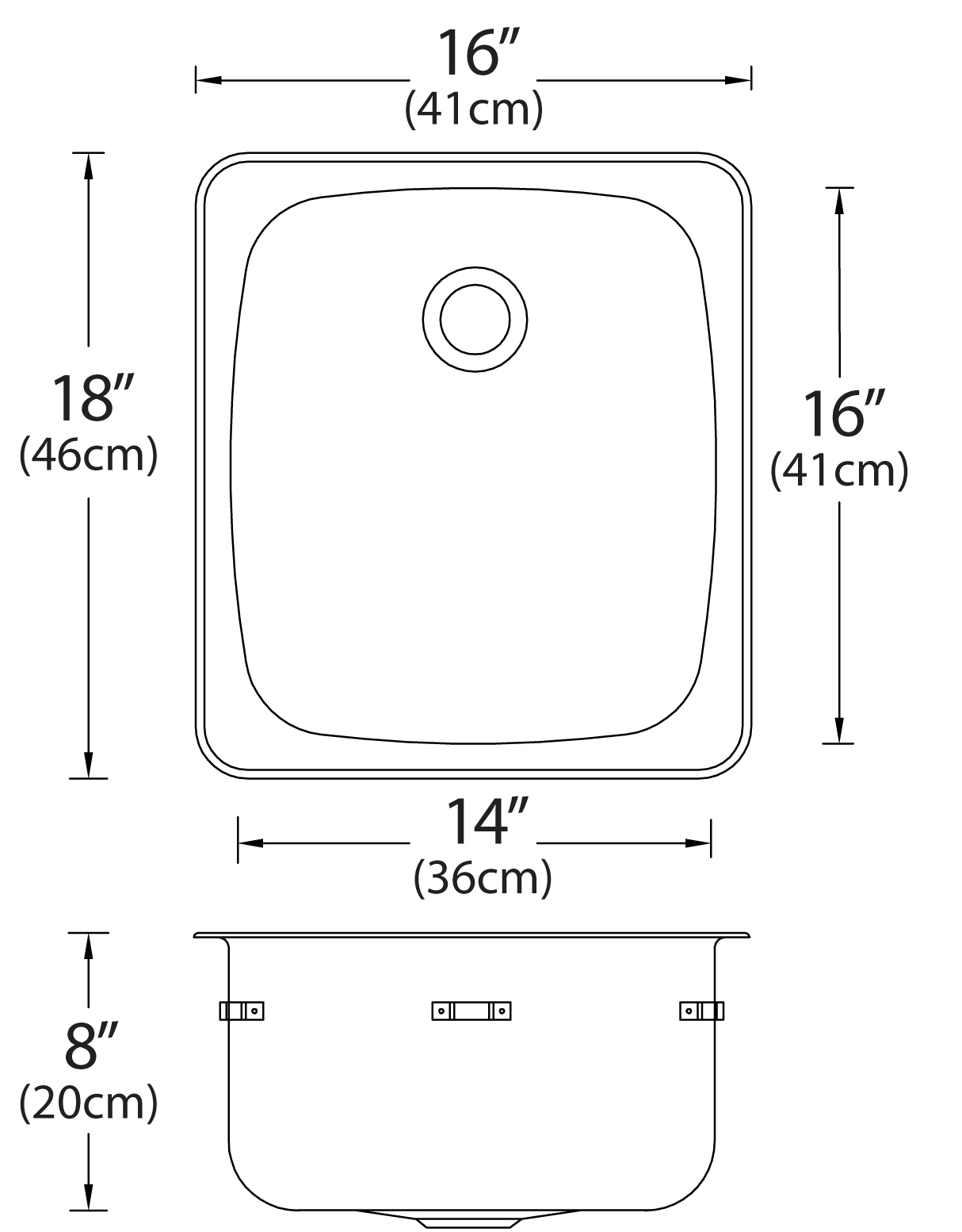 Stainless steel single bowl drop-in sink without ledge, overall dimensions of 16” x 18” (41 cm x 46 cm), bowl dimension of 14” x 16” (36 cm x 41 cm) and a depth of 8” (20 cm). Centre-rear waste, 1 ½” (4 cm) basket strainer assembly with tailpiece included, satin finish, 18Ga. T316, off-the-bowl clamp system, self-rimming, foam in place gasket, includes template and installation hardware.