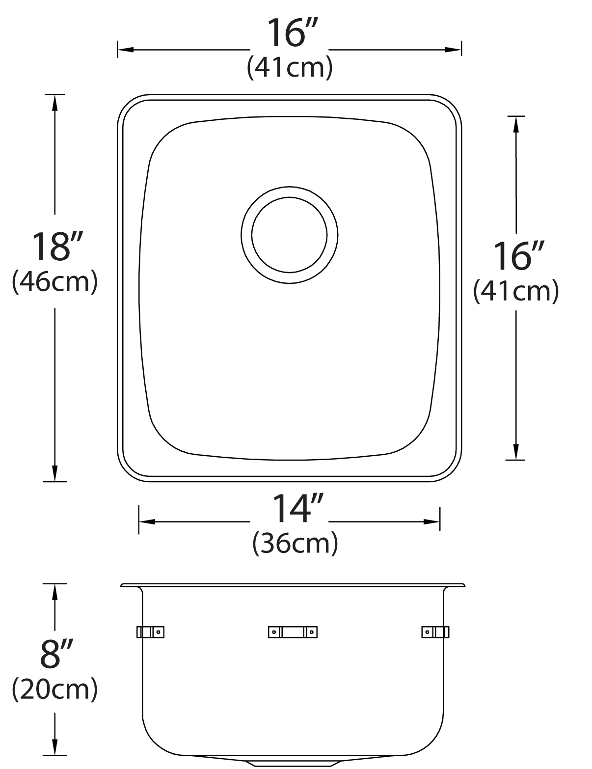 Stainless steel single bowl drop-in sink without ledge, overall dimensions of 16” x 18” (41 cm x 46 cm), bowl dimension of 14” x 16” (36 cm x 41 cm) and a depth of 8” (20 cm). Centre-rear waste, 3 ½” (9 cm) basket strainer assembly with tailpiece included, satin finish, 20Ga. T301, off-the-bowl clamp system, self-rimming, foam in place gasket, includes template and installation hardware.