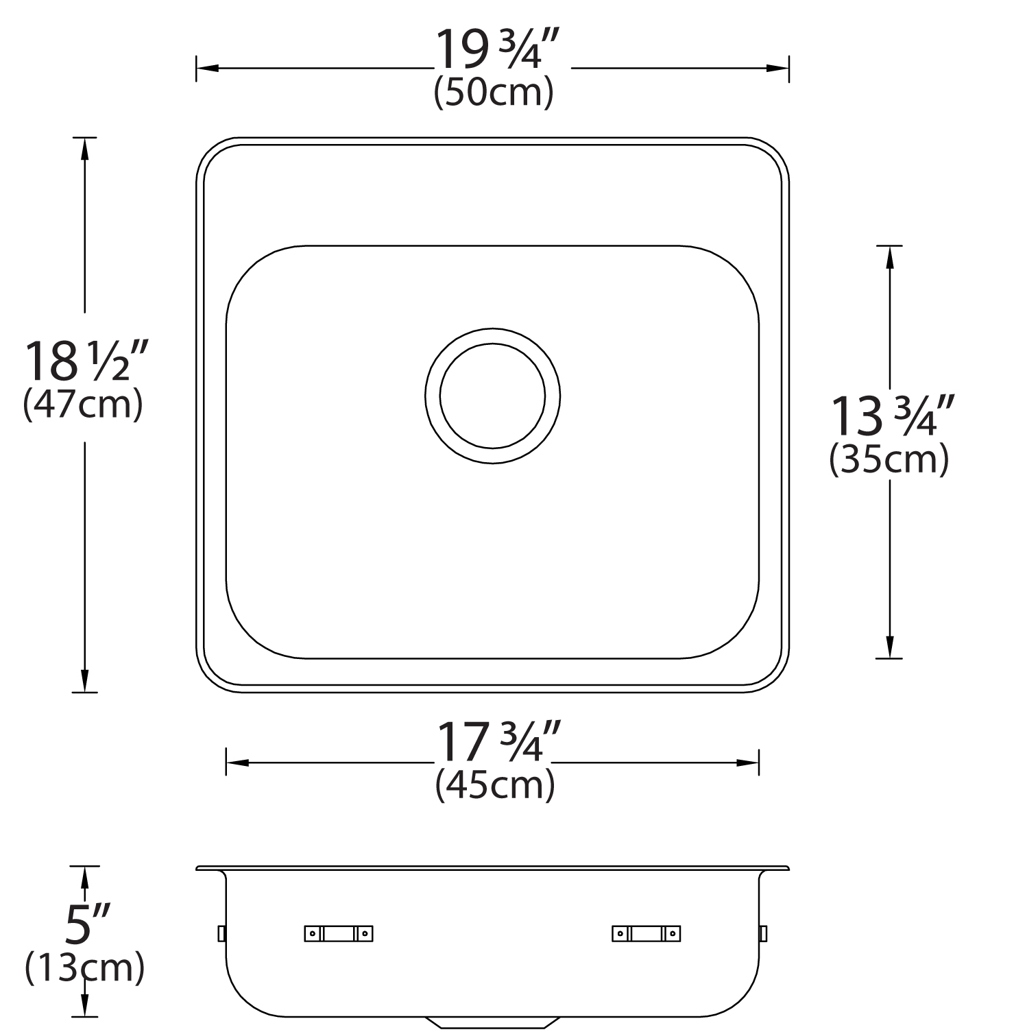 Stainless steel single bowl drop-in sink with ledge, overall dimensions of 18” x 18 ½” (46 cm x 47 cm), bowl dimension of 16” x 14” (41 cm x 36 cm) and a depth of 5” (13 cm). Centre waste, 3 ½” (9 cm) basket strainer assembly with tailpiece included, satin finish, 18Ga. T301, off-the-bowl clamp system, self-rimming, SynkSeal™ foam-in-place gasket installed, includes template and installation hardware.