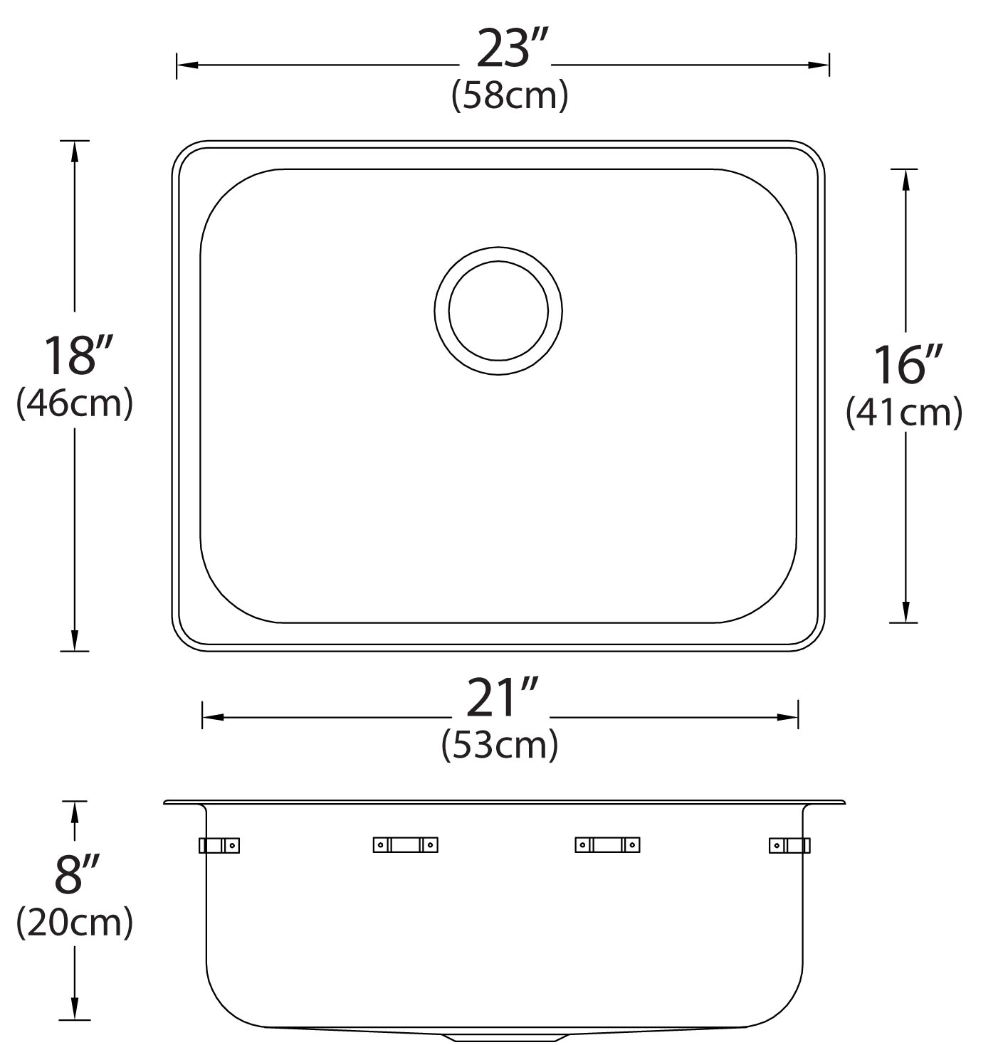 Single bowl drop-in sink without ledge, off the bowl clamp system, self rimming, SynkSeal™ foam in place gasket installed, exposed surfaces finished to a satin finish, sound deadening pads. Includes template and installation hardware.