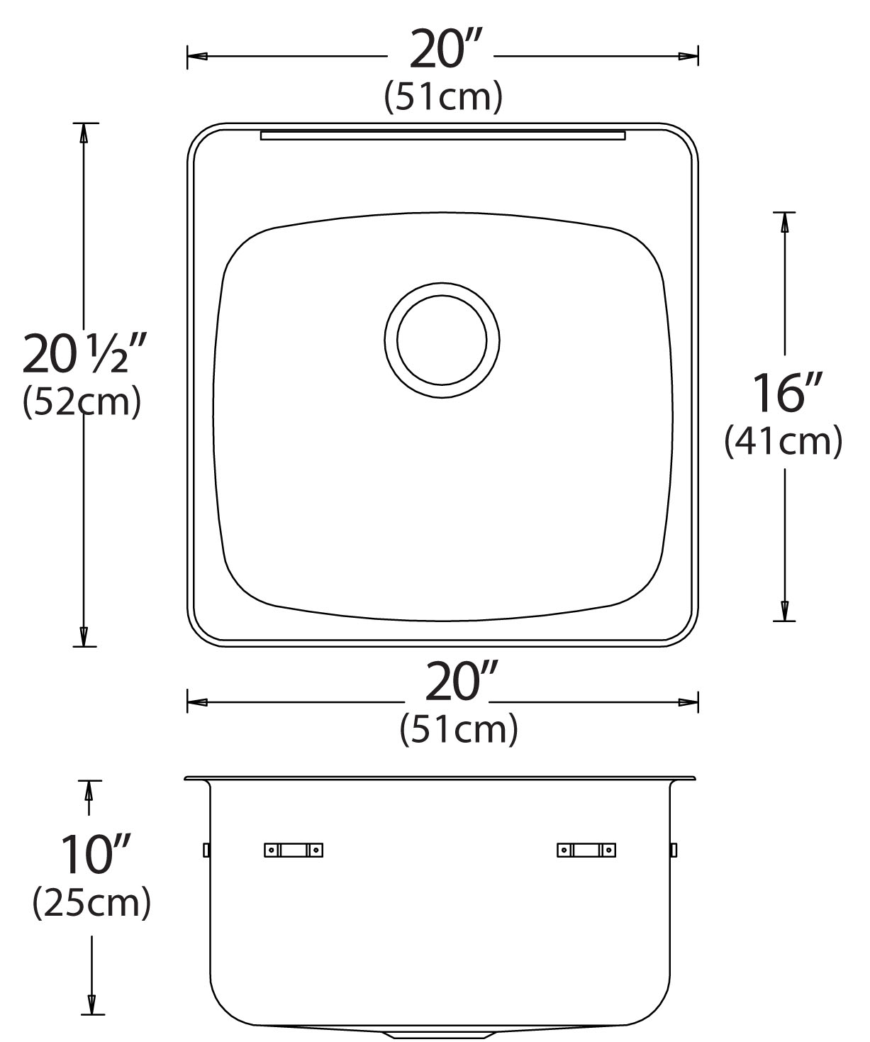 Stainless steel single bowl drop-in sink with ledge, overall dimensions of 20” x 20 ½” (51 cm x 52 cm), bowl dimension of 18” x 16” (46 cm x 41 cm) and a depth of 10” (25 cm). centre-rear waste, 3 ½” (9 cm) basket strainer assembly with tailpiece included, satin finish, 18Ga. T301, off-the-bowl clamp system, self-rimming, SynkSeal™ foam-in-place gasket installed, includes template and installation hardware.