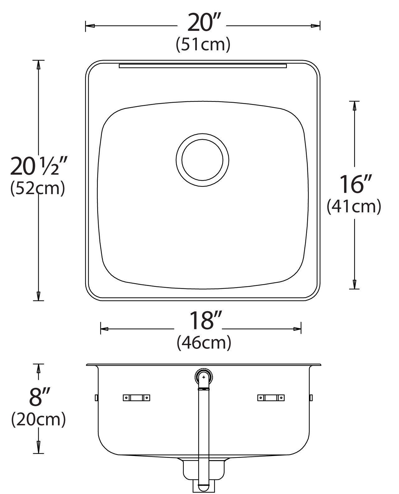 Stainless steel single bowl drop-in sink with ledge, overall dimensions of 20” x 20 ½” (51 cm x 52 cm), bowl dimension of 18” x 16” (46 cm x 41 cm) and a depth of 5” (13 cm). left-rear waste, 3 ½” (9 cm) basket strainer assembly with tailpiece included, satin finish, 18Ga. T301, off-the-bowl clamp system, self-rimming, SynkSeal™ foam-in-place gasket installed, includes template and installation hardware.