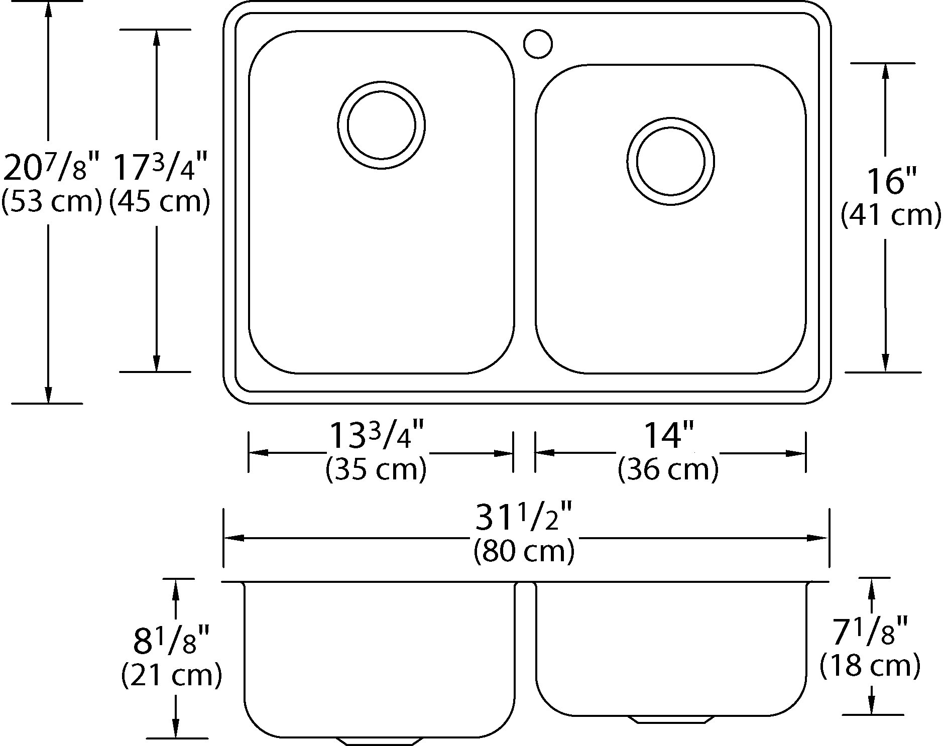 Stainless steel single one and three-quarter bowl drop-in sink. Overall dimensions of 20 ⅞” x 31 ½” (53 cm x 80 cm), left bowl dimensions of 17 ¾” x 13 ¾” (45 cm x 35 cm), right bowl dimensions of 16” x 14” (41 cm x 36 cm), and a depth of 8” (20 cm) and 7” (18 cm). Centre-rear waste, 3 ½” (9 cm) strainer included, brushed satin finish, 18Ga. Off-the-bowl clamp system, factory installed SynkSeal™ foam-in-place gasket, sound deadening pads, custom hole drilling available, includes template and installation hardware.
