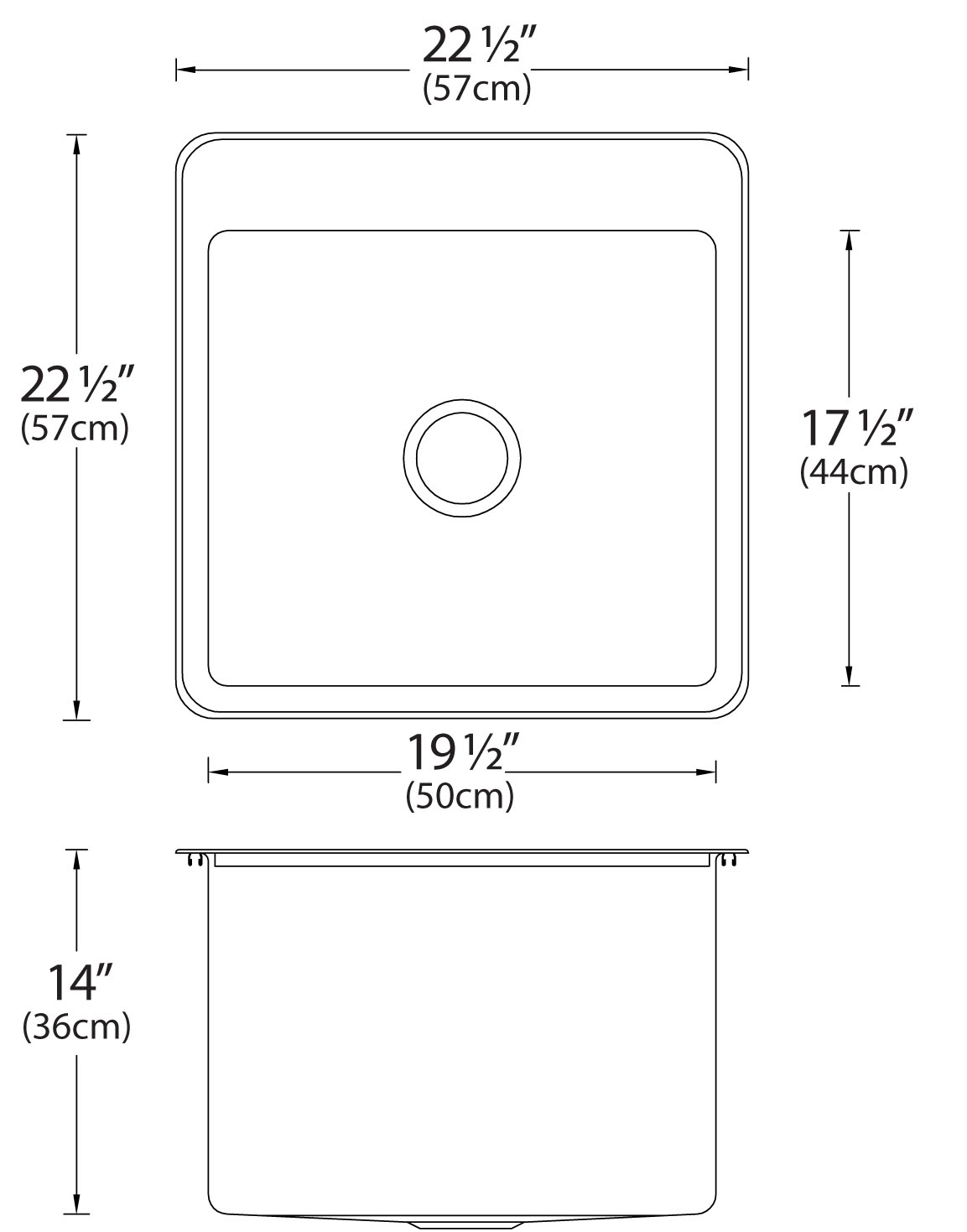 Stainless steel single bowl drop-in sink with ledge, overall dimensions of 22 ½” x 22 ½” (57 cm x 57 cm), bowl dimension of 19 ½” x 17 ½” (50 cm x 44 cm) and a depth of 14” (36 cm). centre waste, 3 ½” (9 cm) basket strainer assembly with tailpiece included, satin finish, 16Ga. T316, off-the-bowl clamp system, self-rimming, foam-in-place gasket installed, includes template and installation hardware.