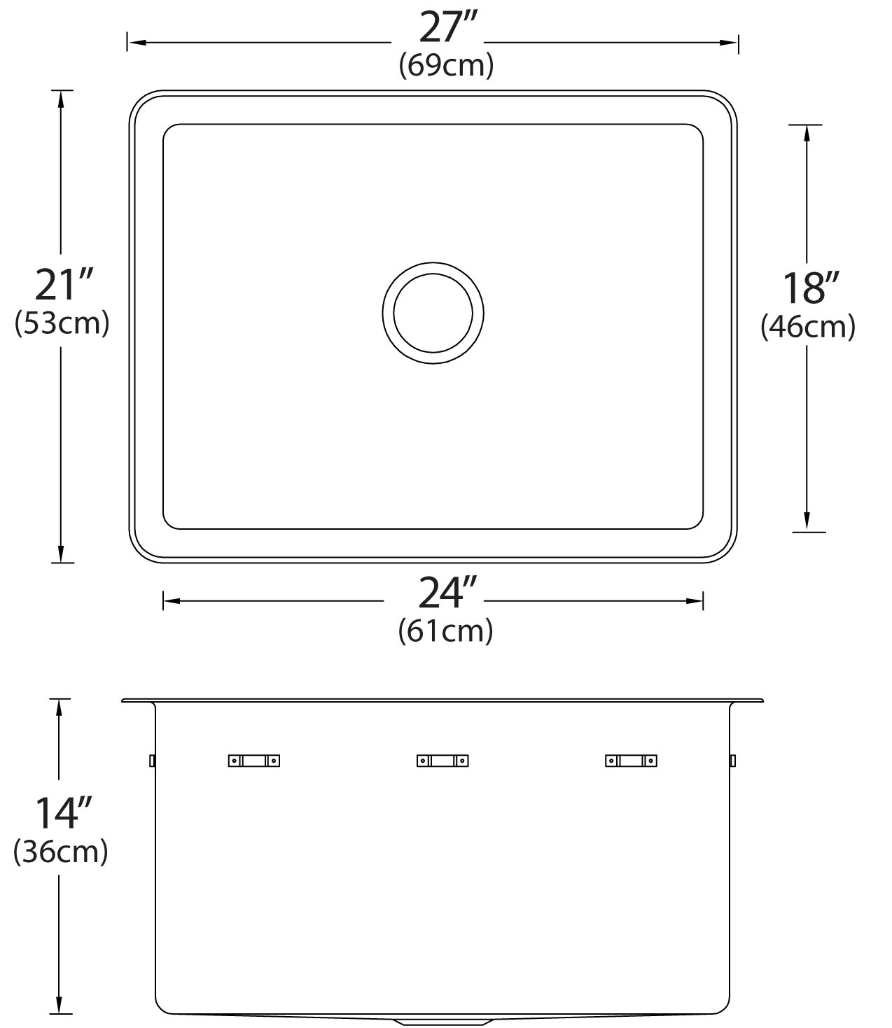 Stainless steel single bowl drop-in sink without ledge, overall dimensions of 27” x 21” (69 cm x 53 cm), bowl dimension of 24” x 18” (61 cm x 46 cm) and a depth of 14” (36 cm). Centre waste, 3 ½” (9 cm) basket strainer assembly with tailpiece included, satin finish, 16Ga. T316, off-the-bowl clamp system, self-rimming, foam-in-place gasket installed, includes template and installation hardware.