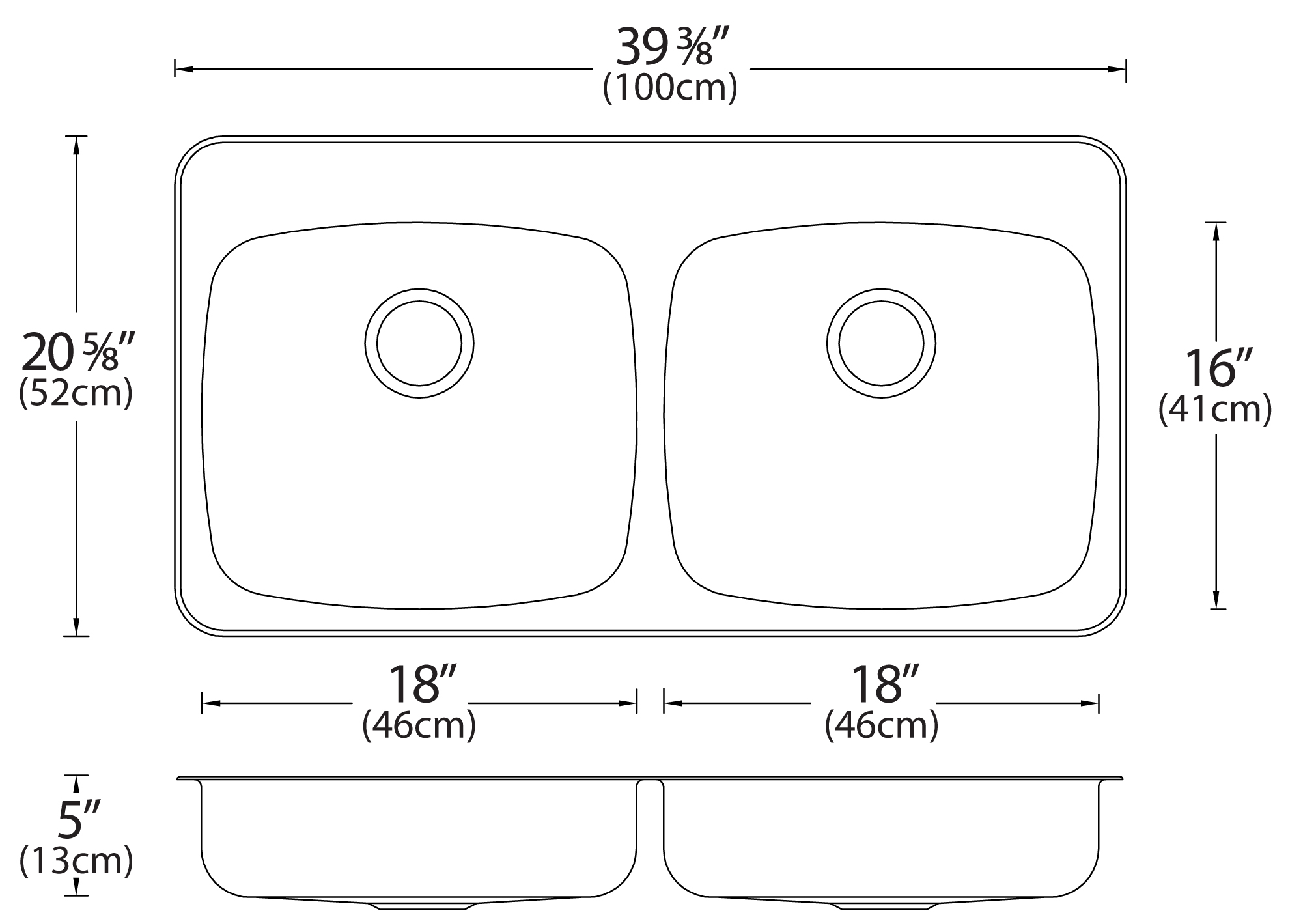 Double bowl drop-in sink with ledge, off the bowl clamp system, self rimming, SynkSeal™ foam in place gasket installed, exposed surfaces finished to a satin finish, sound deadening pads. Includes template and installation hardware.