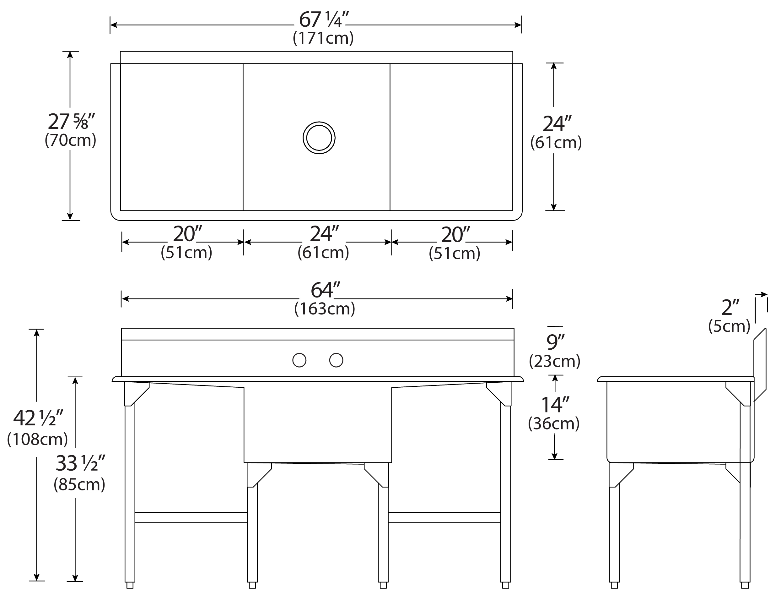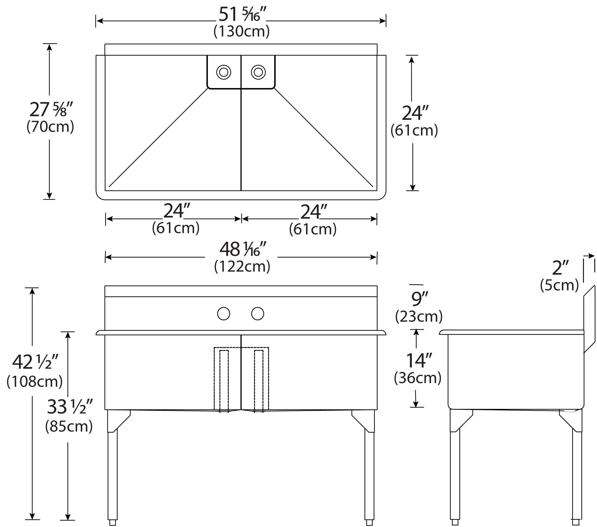 Double bowl scullery sink, exposed surfaces finished to a satin finish. Adjustable bullet feet, radius corners front and back only. Integral backsplash. Three rolled edges.