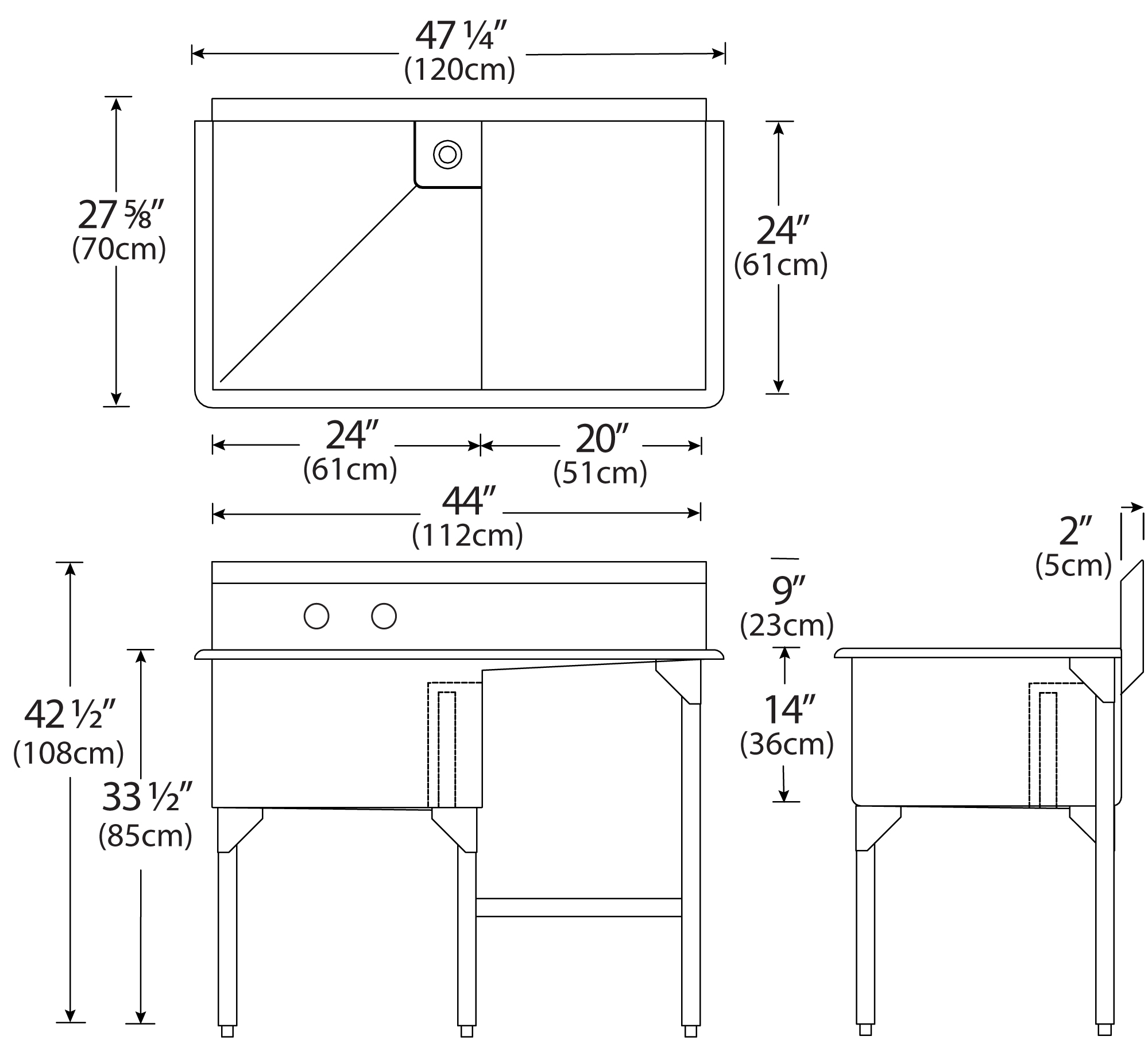 Single bowl scullery sink with single integral right drainboard, exposed surfaces finished to a satin finish. Adjustable bullet feet, radius corners front and back only. Integral backsplash. Three rolled edges.