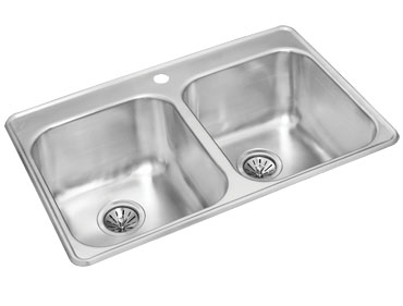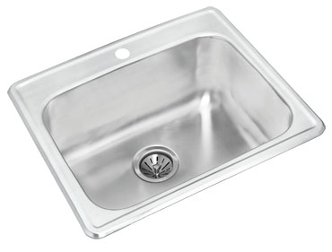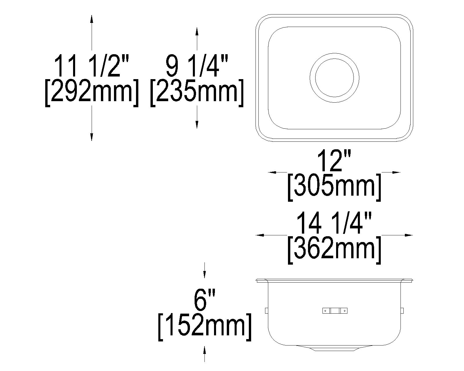 Stainless steel single bowl drop-in sink. Overall dimensions of 11 ½” x 14 ¼” (29 cm x 36 cm), bowl dimensions of 9 ¼” x 12” (23 cm x 30 cm), and a depth of 6” (15 cm). Centre waste, 3 ½” (9 cm) strainer included, mirror finish, 18Ga. Off-the-bowl clamp system, factory installed SynkSeal™ foam-in-place gasket, sound deadening pads, includes template and installation hardware.