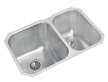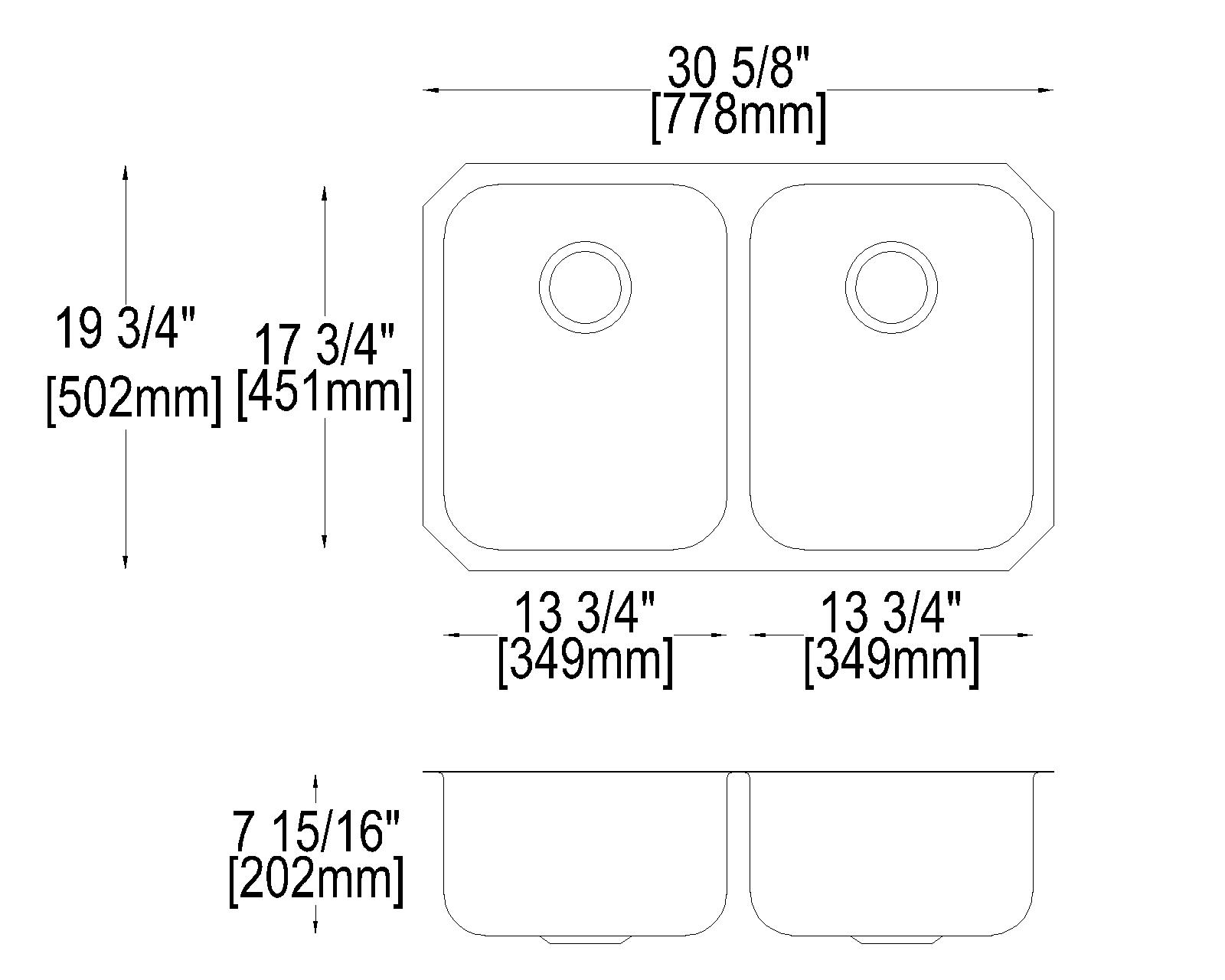 Stainless steel double bowl undermount sink. Overall dimensions of 19 ¾” x 30 ⅝” (58 cm x 78 cm), left bowl dimensions of 17 ¾” x 13 ¾” (45 cm x 35 cm), right bowl dimensions of 17 ¾” x 13 ¾” (45 cm x 35 cm), and a depth of 8” (20 cm). Centre-rear waste, 3 ½” (9 cm) strainer included, brushed satin finish, 18Ga.