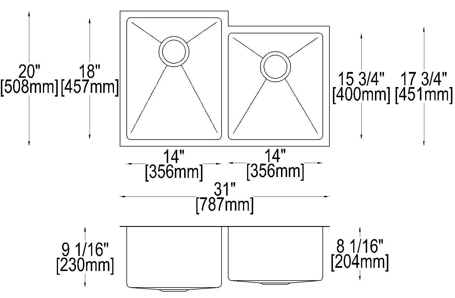 Stainless steel one and a half bowl undermount sink. Overall dimensions of 20” x 31” (51 cm x 79 cm), left bowl dimensions of 18” x 14” (46 cm x 36 cm), right bowl dimensions of 15 ¾” x 14” (40 cm x 36 cm), and a depth of 9” (23 cm) and 8” (20 cm). Centre-rear waste, 3 ½” (9 cm) strainer included, brushed satin finish, 18Ga.