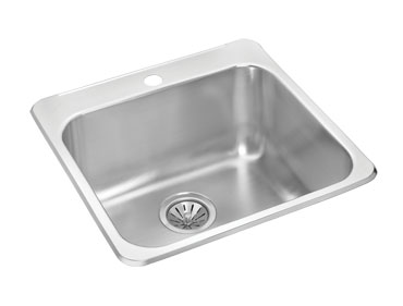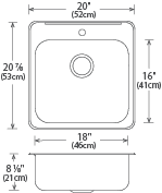 Stainless steel single bowl drop-in sink. Overall dimensions of 20 ½” x 20” (53 cm x 52 cm), left bowl dimensions of 16” x 18” (41 cm x 46 cm), and a depth of 8” (20 cm). Centre-rear waste, 3 ½” (9 cm) strainer included, mirror finish, 18Ga. Off-the-bowl clamp system, factory installed SynkSeal™ foam-in-place gasket, sound deadening pads, custom hole drilling available, includes template and installation hardware.