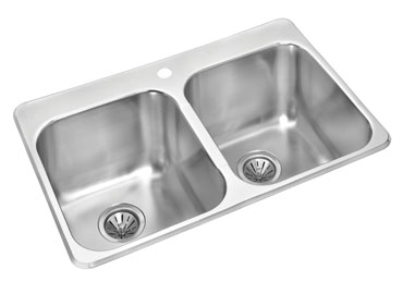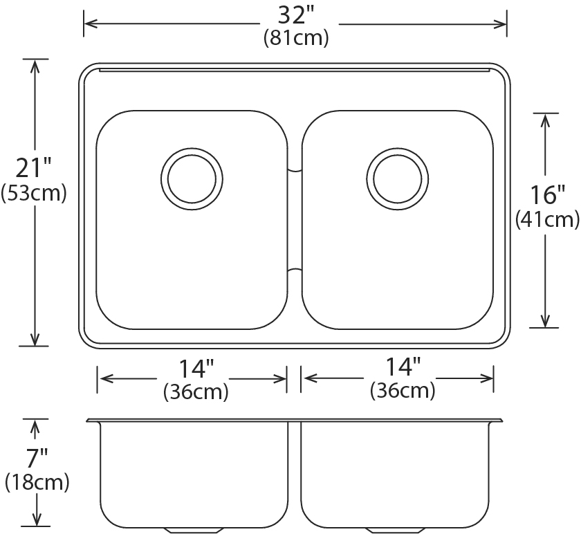 Stainless steel double bowl drop-in sink. Overall dimensions of 21” x 32” (53 cm x 81 cm), left bowl dimensions of 16” x 14” (41 cm x 36 cm), right bowl dimensions of 16” x 14” (41 cm x 36 cm), and a depth of 7” (18 cm). Centre-rear waste, 3 ½” (9 cm) strainer included, mirror finish, 18Ga. Off-the-bowl clamp system, factory installed SynkSeal™ foam-in-place gasket, sound deadening pads, custom hole drilling available, includes template and installation hardware.