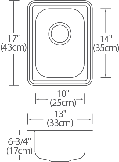 Stainless steel single bowl drop-in sink. Overall dimensions of 17” x 13” (43 cm x 33 cm), bowl dimensions of 14” x 10” (36 cm x 25 cm), and a depth of 6 ¾” (17 cm). Centre-rear waste, 3 ½” (9 cm) strainer included, brushed satin finish, 18Ga. Off-the-bowl clamp system, factory installed SynkSeal™ foam-in-place gasket, sound deadening pads, includes template and installation hardware.