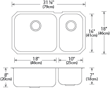Stainless steel one and a half bowl drop-in sink. Overall dimensions of 18” x 31 ½” (46 cm x 80 cm), left bowl dimensions of 16” x 18” (41 cm x 46 cm), right bowl dimensions of 16” x 10” (41 cm x 25 cm), and a depth of 8” (20 cm) and 7” (18 cm). Centre-rear waste, 3 ½” (9 cm) strainer included, brushed satin finish, 18Ga. Off-the-bowl clamp system, factory installed SynkSeal™ foam-in-place gasket, sound deadening pads, includes template and installation hardware.