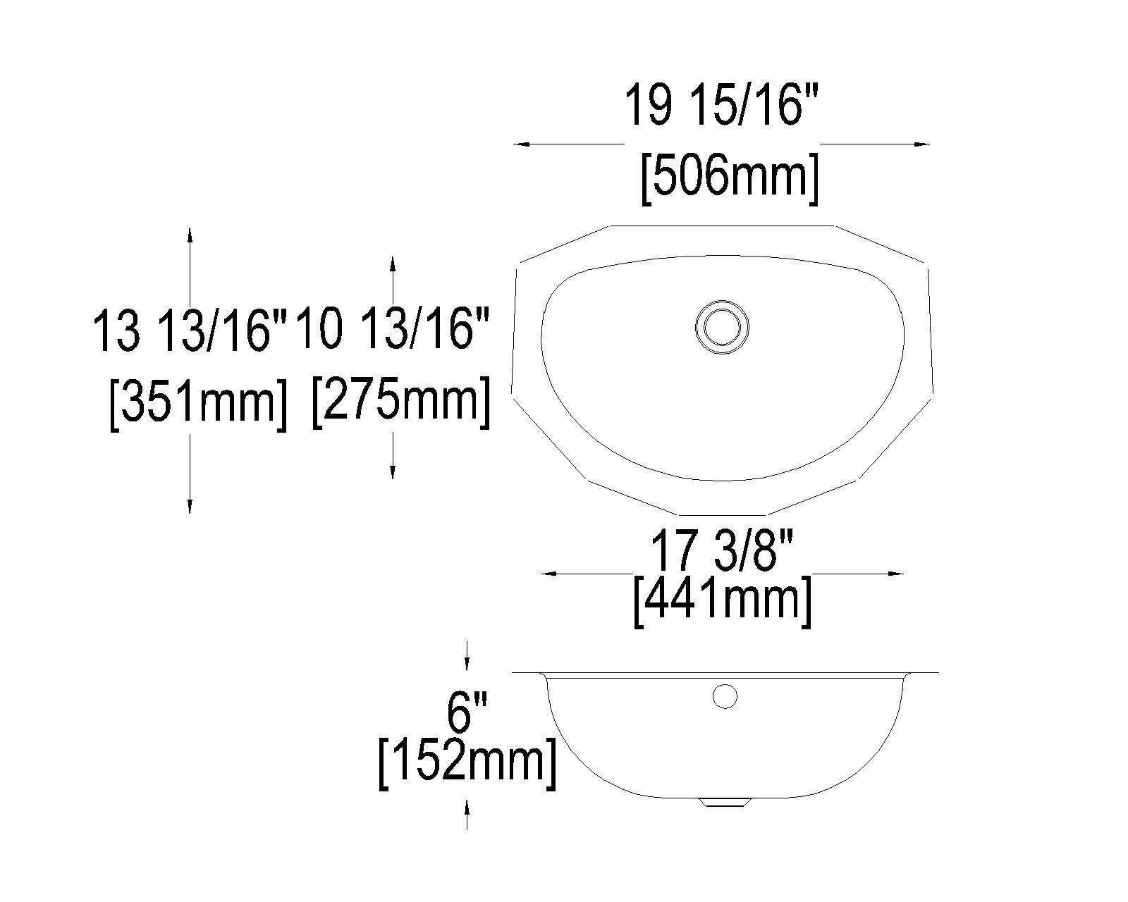 Stainless steel vanity undermount sink, overall dimension of 13 13/16” x 19 15/16” (35 cm x 51 cm), basin dimension of 10 13/16” x 17 ⅜” (27 ½ cm x 44 cm) and a depth of 6” (15 cm). Includes 1 ½” drain hole and overflow assembly, sound deadening pads, rail mounting system, and factory applied sound deadening spray.