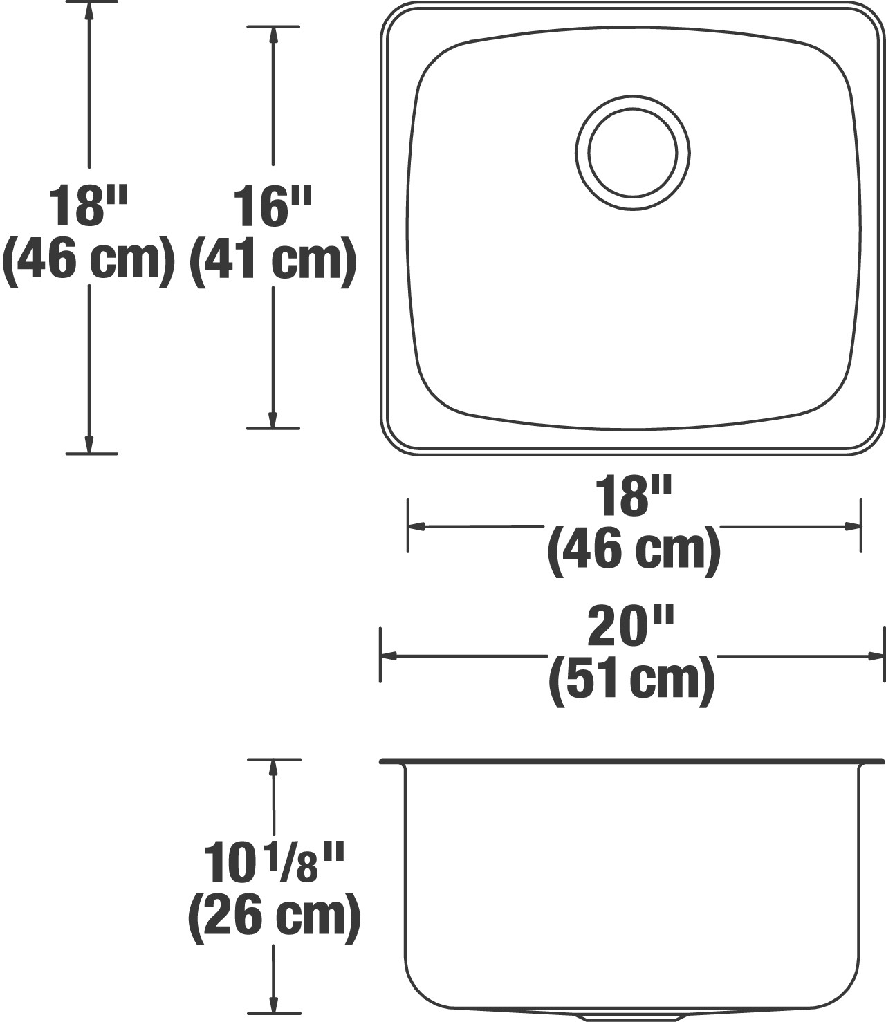 Stainless steel single bowl drop-in laundry sink. Overall dimensions of 18” x 20” (46 cm x 51 cm), bowl dimensions of 16” x 18” (41 cm x 46 cm), and a depth of 10” (25 cm). Centre-rear waste, 3 ½” (9 cm) strainer included, mirror finish, 18Ga. Off-the-bowl clamp system, factory installed SynkSeal™ foam-in-place gasket, sound deadening pads, includes template and installation hardware.