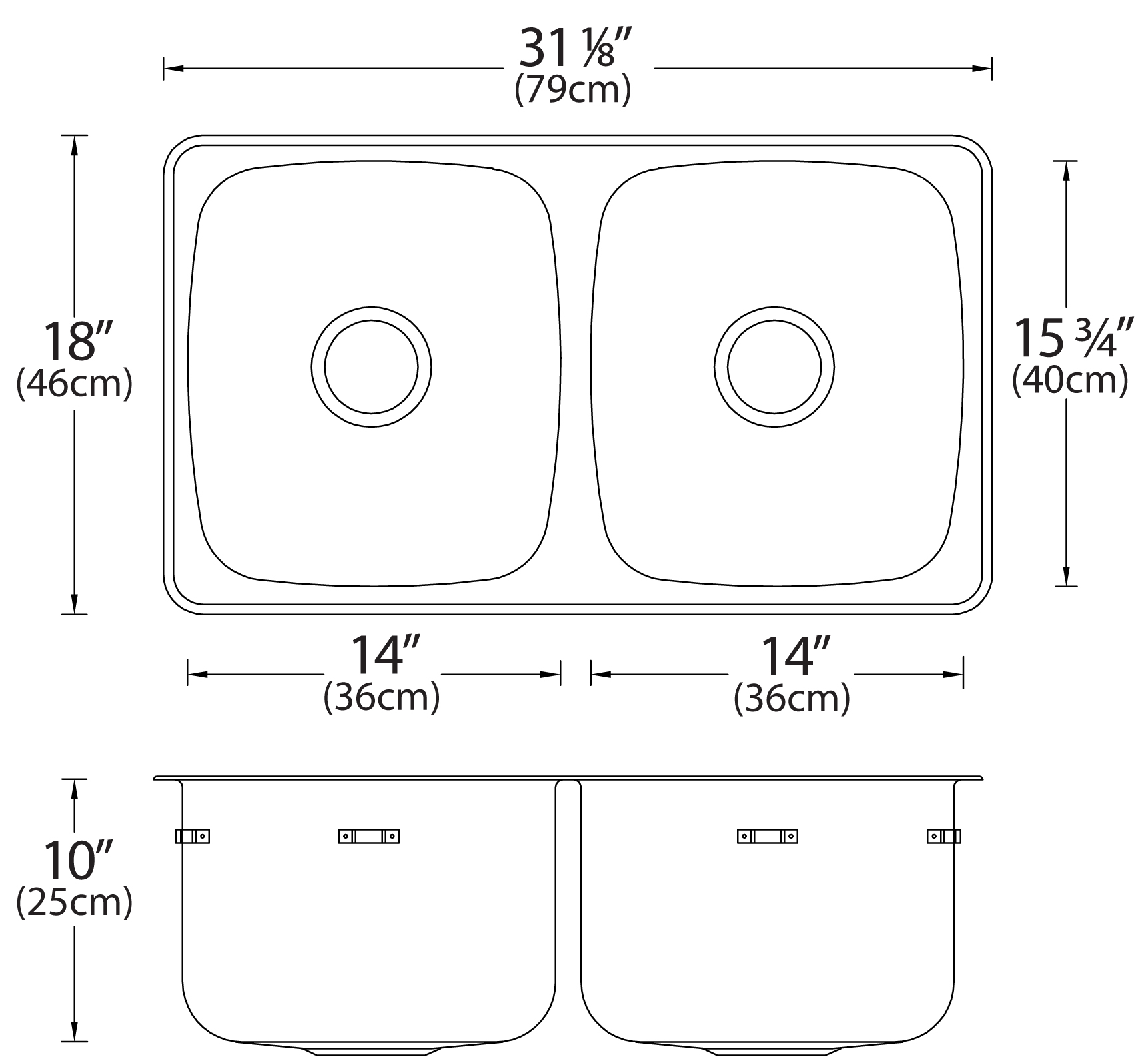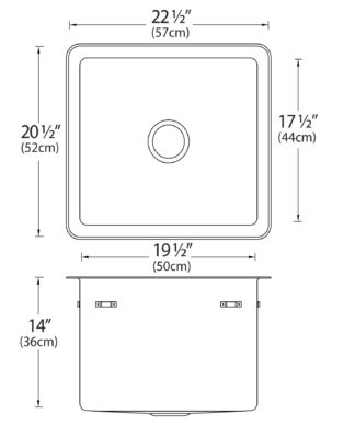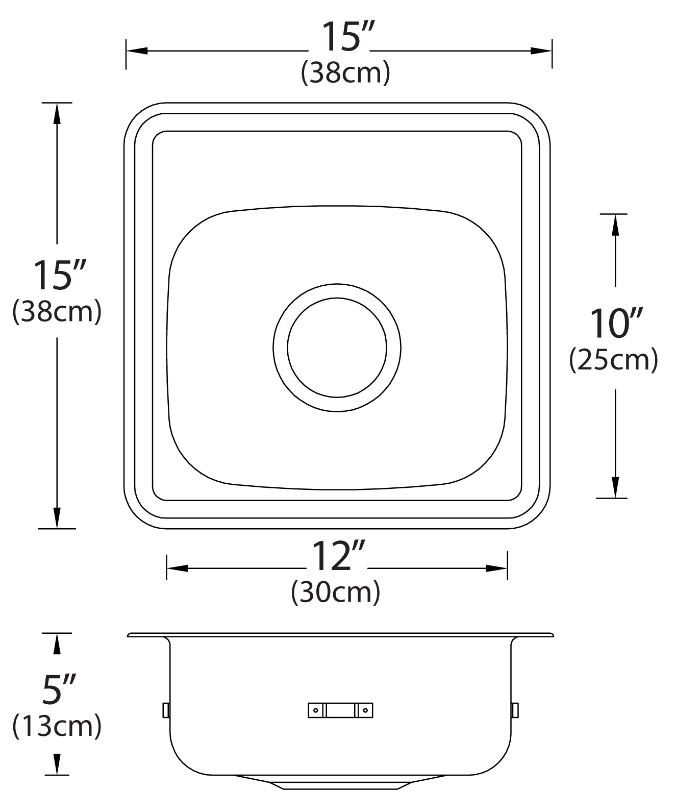 Stainless steel single bowl drop-in sink with ledge, overall dimensions of 15” x 15” (38 cm x 38 cm), bowl dimension of 12” x 10” (30 cm x 25 cm) and a depth of 5” (13 cm). Centre waste, 3 ½” (9 cm) basket strainer assembly with tailpiece included, satin finish, 18Ga. T301, off-the-bowl clamp system, self-rimming, SynkSeal™ foam-in-place gasket installed, includes template and installation hardware.