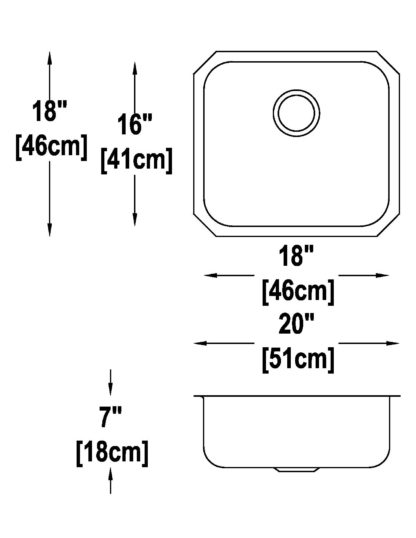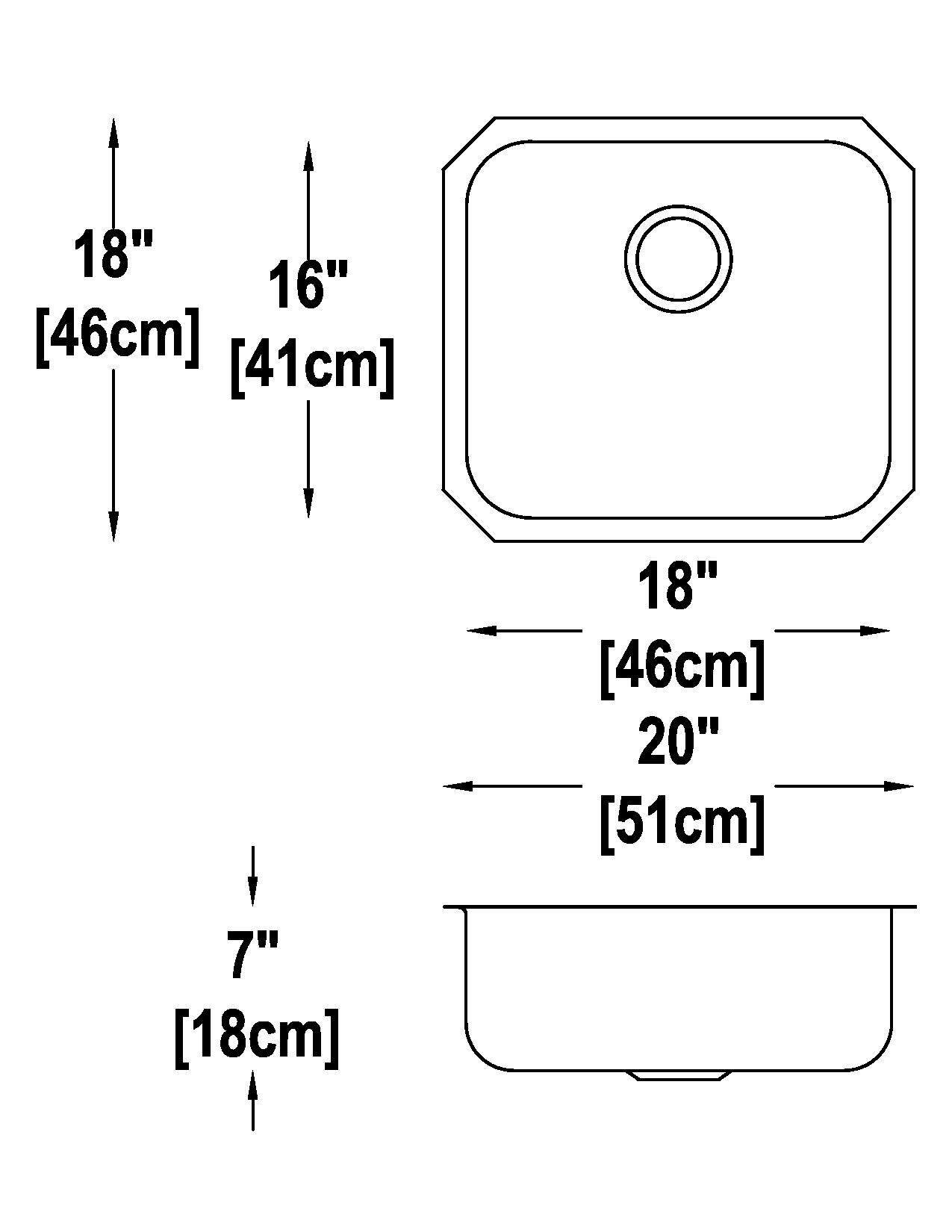 Stainless steel single bowl undermount sink. Overall dimensions of 18” x 20” (46 cm x 51 cm), bowl dimensions of 16” x 18” (41 cm x 46 cm), and a depth of 7” (18 cm). Centre-rear waste, 3 ½” (9 cm) strainer included, brushed satin finish, 18Ga, sound deadening pads.