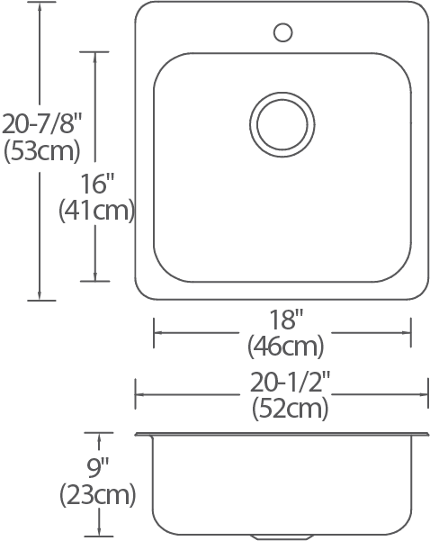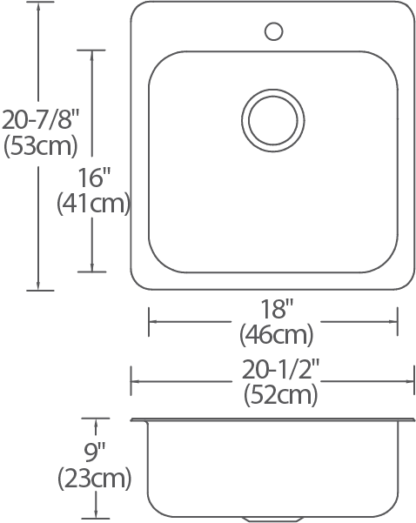 Stainless steel single bowl drop-in sink. Overall dimensions of 20 ½” x 20” (53 cm x 52 cm), left bowl dimensions of 16” x 18” (41 cm x 46 cm), and a depth of 9” (23 cm). Centre-rear waste, 3 ½” (9 cm) strainer included, mirror finish, 18Ga. Off-the-bowl clamp system, factory installed SynkSeal™ foam-in-place gasket, sound deadening pads, custom hole drilling available, includes template and installation hardware.