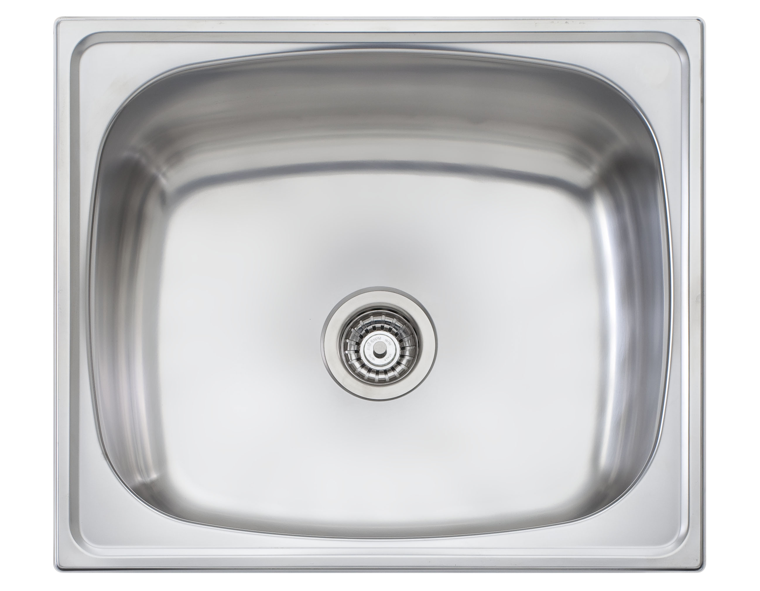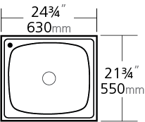 Stainless steel single bowl universal mount Oliveri sink. Overall dimensions of 21 ¾” x 24 ¾” (53 cm x 61 cm), bowl dimensions of 18 ¾” x 22″ (46 cm x  56 cm), and a depth of 12 ½” (32 cm). Centre waste, 3 ½” (9 cm) strainer included.