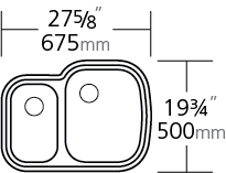 Stainless steel double bowl undermount Oliveri sink. Overall dimensions of 19 ¾” x 27 ⅝” (48 cm x 69 cm), left bowl dimensions of 13 ¾” x 8 ½” (33 cm x  20 cm), right bowl dimensions of 16 ½” x 13 ¾” (41 cm x 33 cm), and a depth of 6″ (15 cm) and 8″ (20 cm). Centre-rear waste, 3 ½” (9 cm) strainer included.