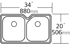 Stainless steel double bowl universal mount Oliveri sink. Overall dimensions of 20″ x 35″ (51 cm x 89 cm), left bowl dimensions of 17″ x 15″ (43 cm x  38 cm), right bowl dimensions of 17″ x 15″ (43 cm x  38 cm), and a depth of 8″ (20 cm). Centre-rear waste, 3 ½” (9 cm) strainers included.